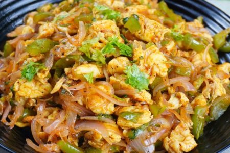 ആദ്യമായി ക്യാപ്സിക്കവും വെളുത്തുള്ളിയും പച്ചമുളകും സവാളയും ചെറുതായി അരിഞ്ഞു വെക്കുക. ഇനി അഞ്ചു മുട്ടയെടുത്ത് ഒരു പാത്രത്തിലേക്ക് പൊട്ടിച്ച് ആവശ്യത്തിന് ഉപ്പും ചേർത്ത് നന്നായി ഇളക്കുക. അടുത്തതായി ഒരു ചീനച്ചട്ടി എടുക്കുക. അതിലേക്ക് അല്പം എണ്ണ ഒഴിച്ച് ചൂടാക്കാൻ വയ്ക്കുക. ഇനി അത് എല്ലാ ഭാഗത്തേക്കും എണ്ണ വ്യാപിപ്പിക്കാം. ശേഷം മാറ്റിവെച്ച മുട്ട ഇതിലേക്ക് ഒഴിച്ച് നന്നായി ഇളക്കുക. ഇതൊന്ന് പാകമായതിനു ശേഷം മറ്റൊരു പാത്രത്തിലേക്ക് മാറ്റാം.