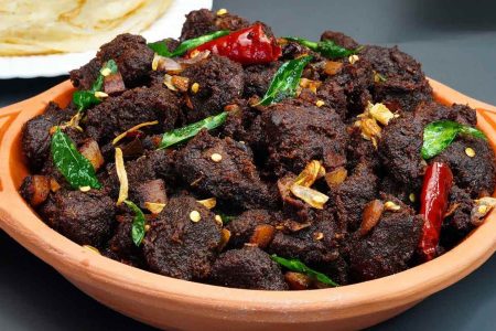 Kerala Style Beef Fry, also known as Beef Ularthiyathu, is a spicy, flavorful dish that’s a favorite in Kerala cuisine. Tender beef pieces are pressure-cooked with turmeric, chili powder, coriander, black pepper, and garam masala, then slow-roasted in coconut oil with sliced onions, curry leaves, garlic, and crushed whole spices like fennel and cloves. The addition of roasted coconut bits enhances the texture and taste, giving it a rich, earthy flavor. This dry beef fry is typically served with Kerala porotta, rice, or appam, making it a hearty and satisfying dish loved for its bold, aromatic profile.